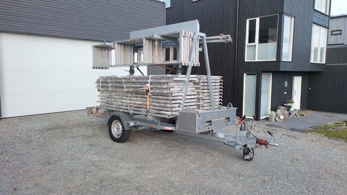 Stillas til leie. Det er lett å sette opp med lav vekt. Stillaset står klar for henting på henger (tilhenger inkludert i prisen). Pakken kan bygges som en gavl på 4 etasjer, med 9m lengde x 11m arbeidshøyde, eller som 2 etasjer med 15 meter lengde. Det er god kvalitet med belastningsklasse 3, med type aluminium.