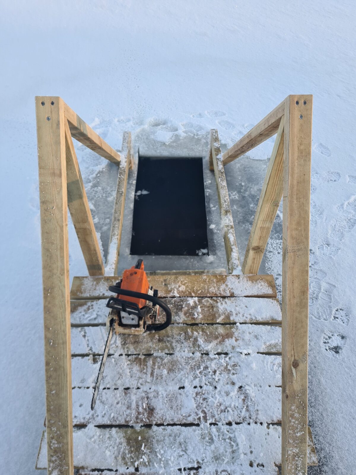 Badning og brug af økser/isave på eget ansvar. Spring eller dyk ikke, da vandet er lavt.
