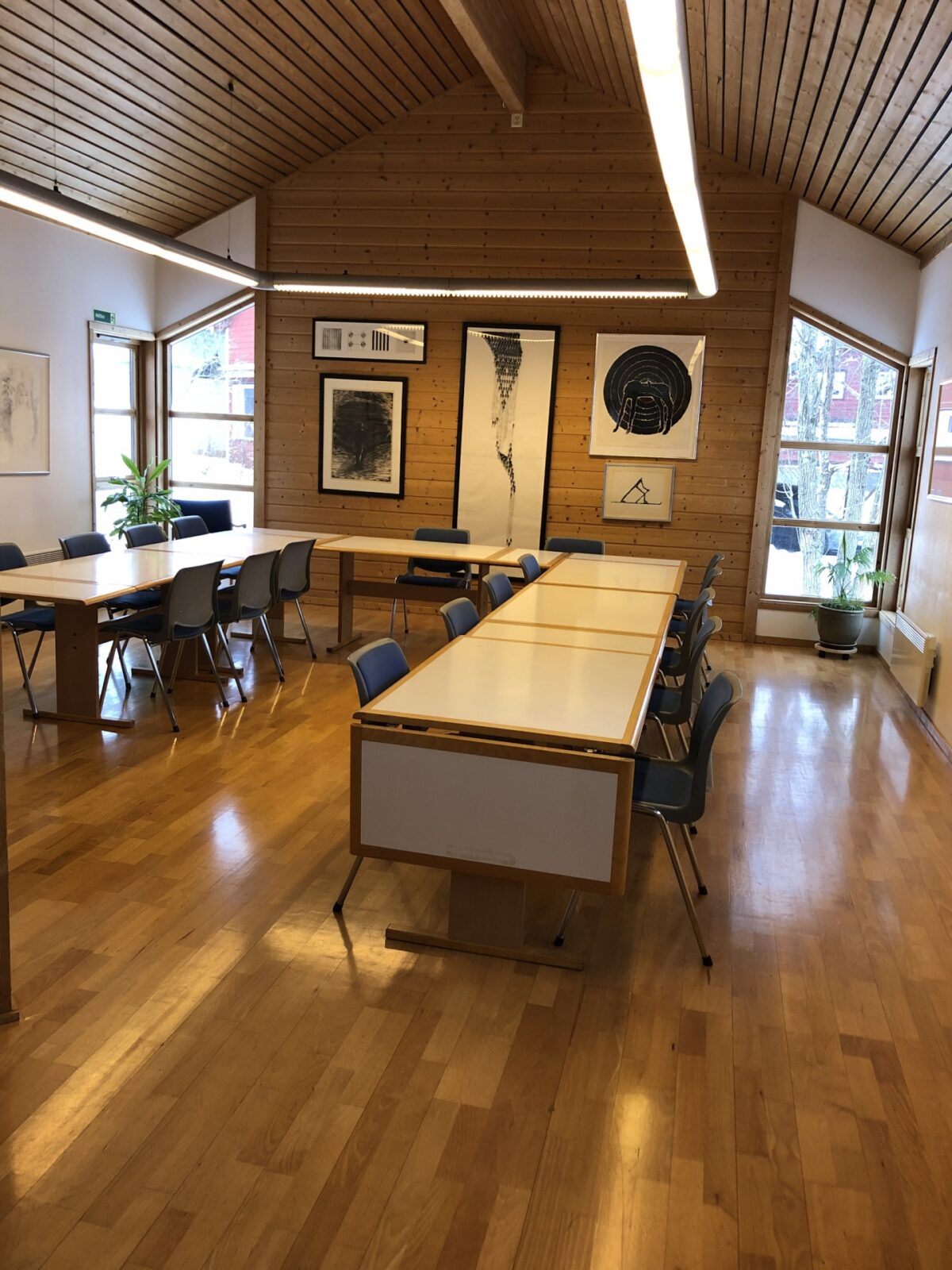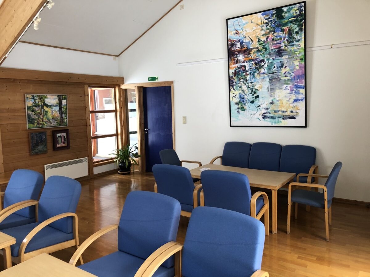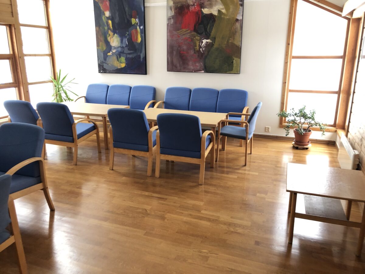 Salong innredet med sofagrupper og utgang til terrase. Lokalet ligger i tilknytning til storsalen