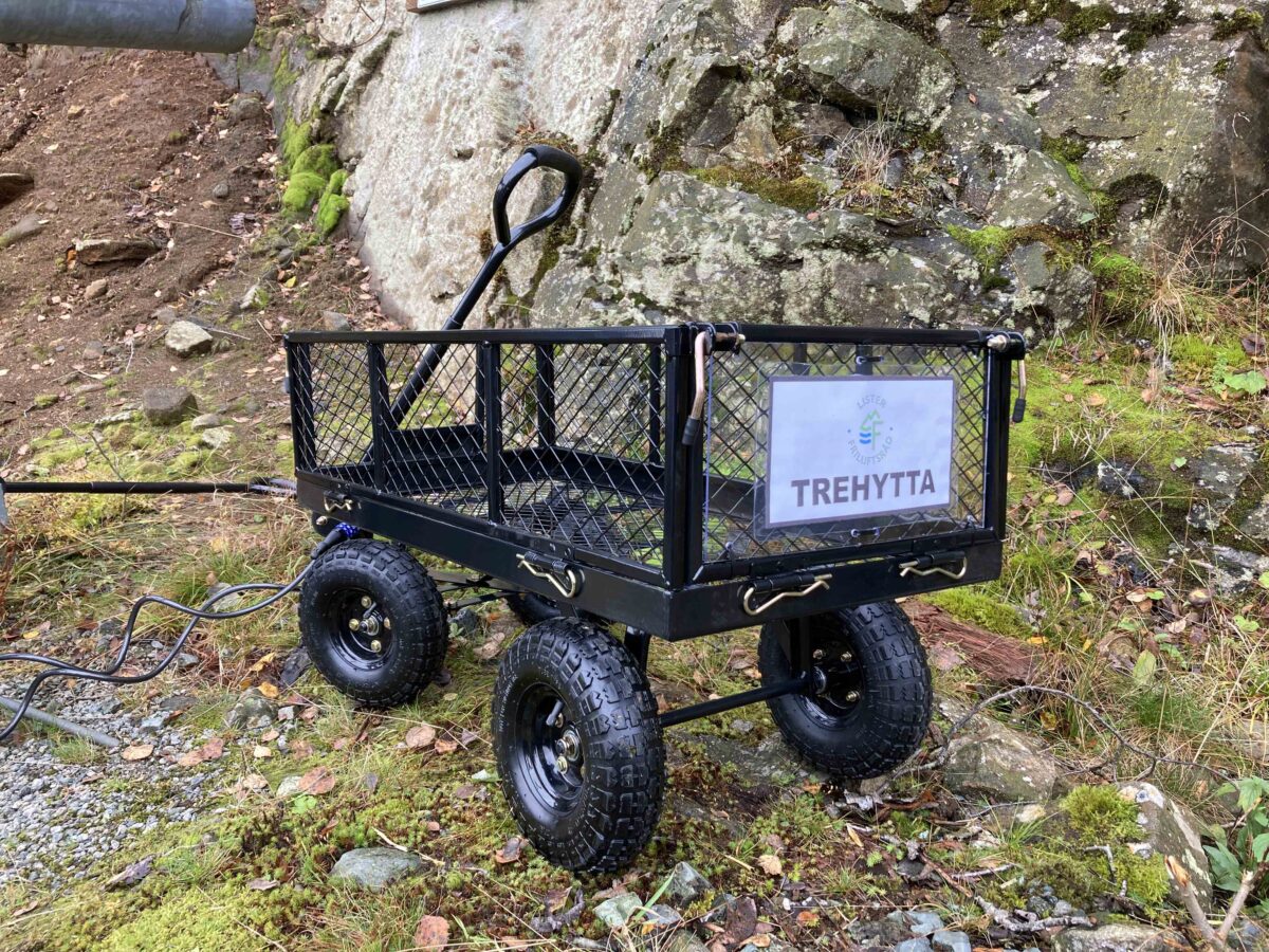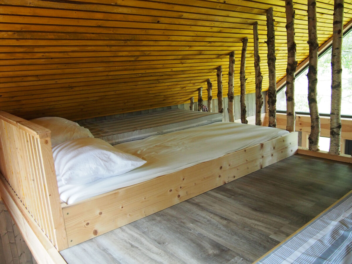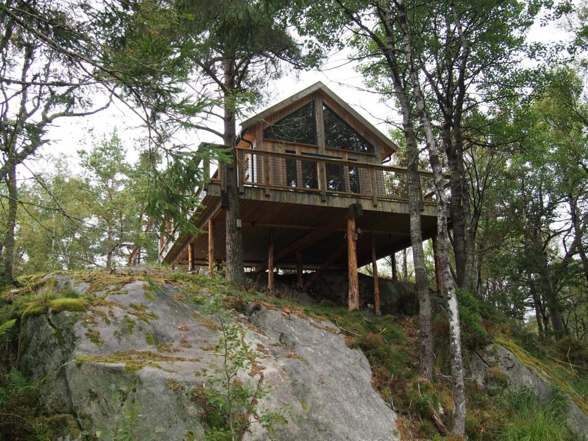 Hytta er bygd som en delvis tretopphytte med forankring i bakken i bakkant og feste i to trær i fronten ut mot leirområdet på Laundal. I trehytta er det ett soverom med en enkeltseng og en hems med fire sengeplasser. Det er puter til hver seng. Det er ikke dyner på hytta så sovepose, laken og putetrekk med medbringes.