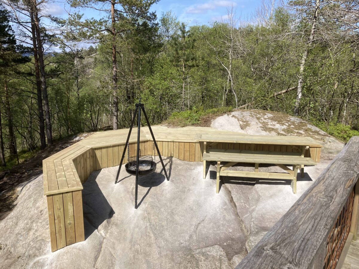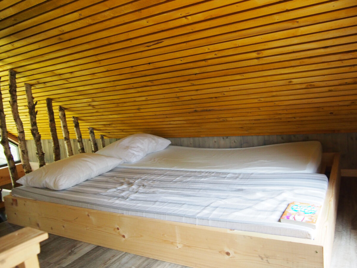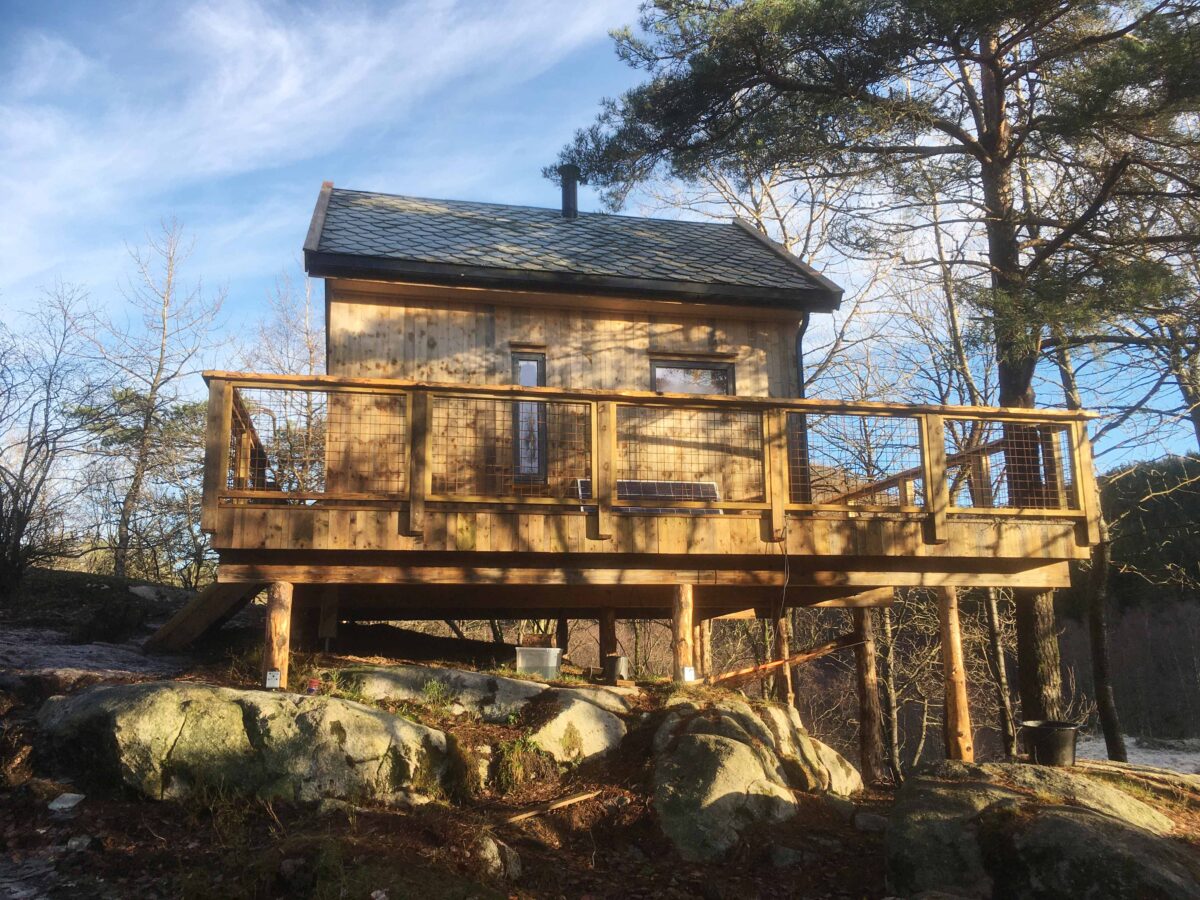 Hytta er bygd som en delvis tretopphytte med forankring i bakken i bakkant og feste i to trær i fronten ut mot leirområdet på Laundal. I trehytta er det ett soverom med en enkeltseng og en hems med fire sengeplasser. Det er puter til hver seng. Det er ikke dyner på hytta så sovepose, laken og putetrekk med medbringes.