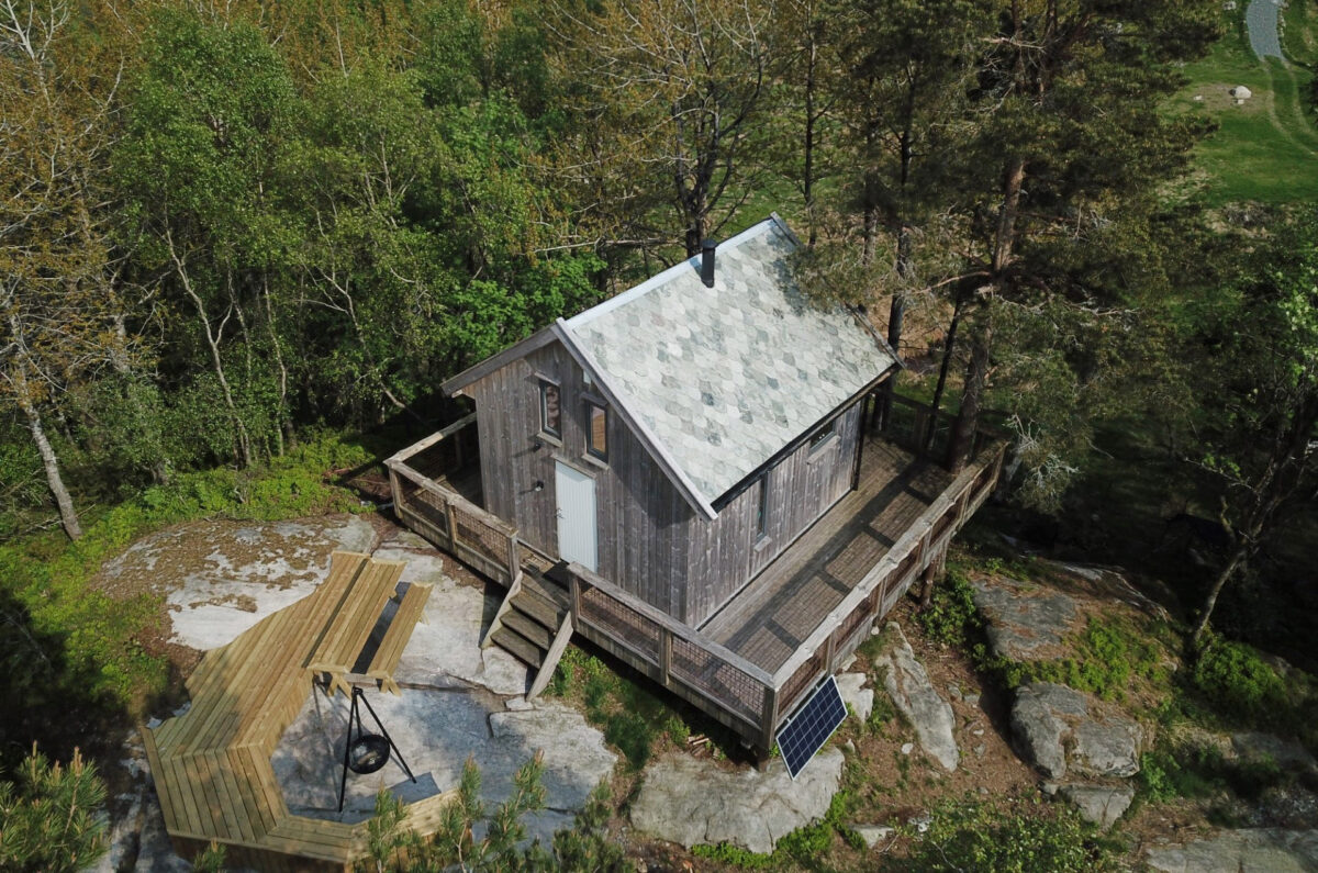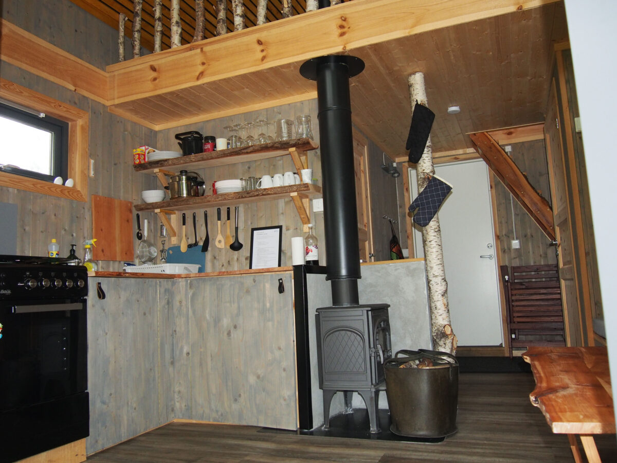 Kjøkkenkrok med gasskomfyr, gryter og steikepanne, tallerkner, glass, kopper og bestikk. Vedovn og sofakrok. Det er montert solcelleanlegg som gir strøm til lys. Et lite bad med vaskevannsfat og tissedo. Veranda rundt hele hytta.