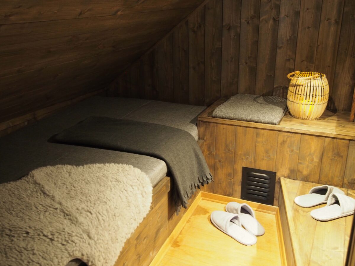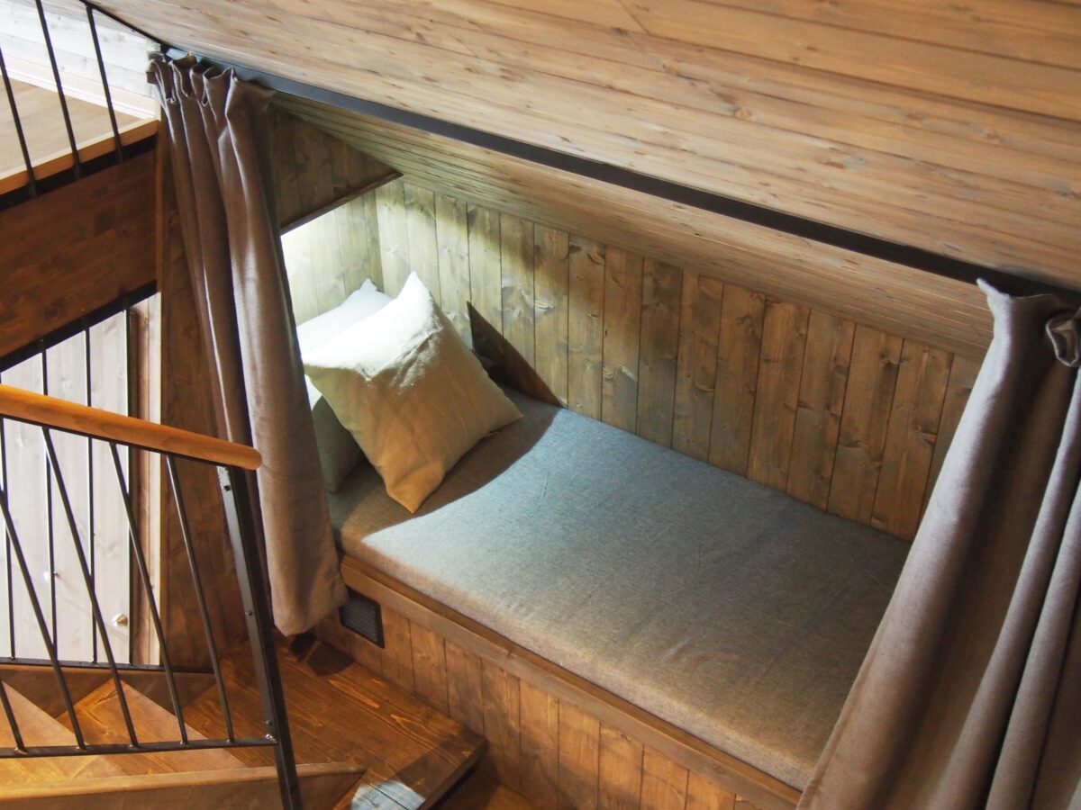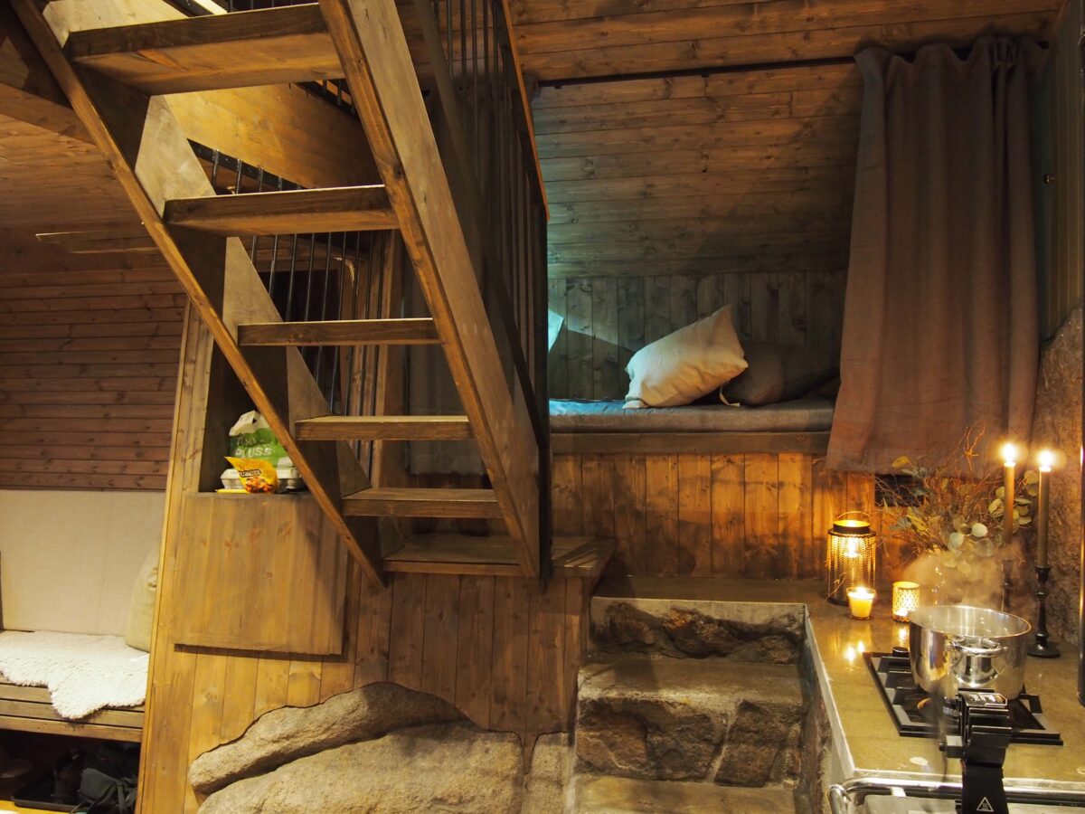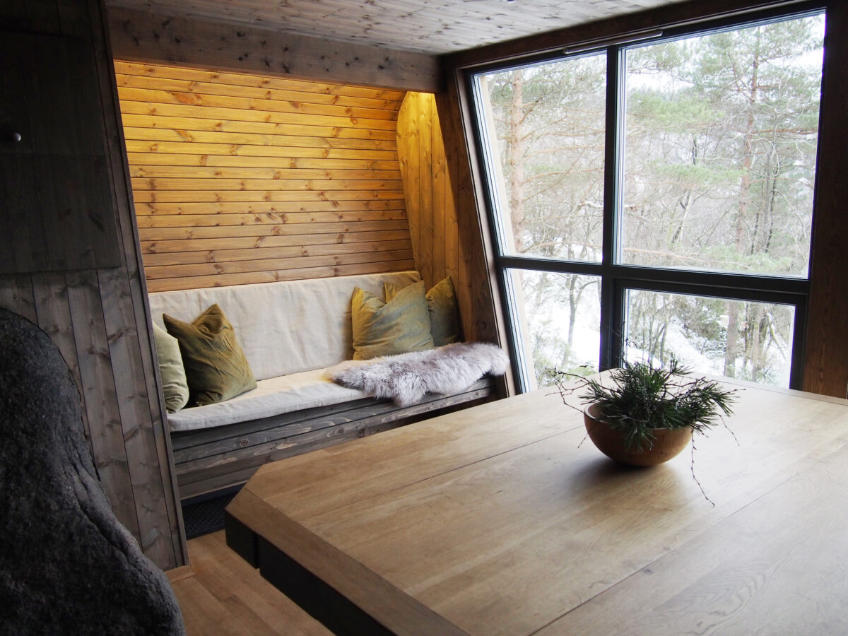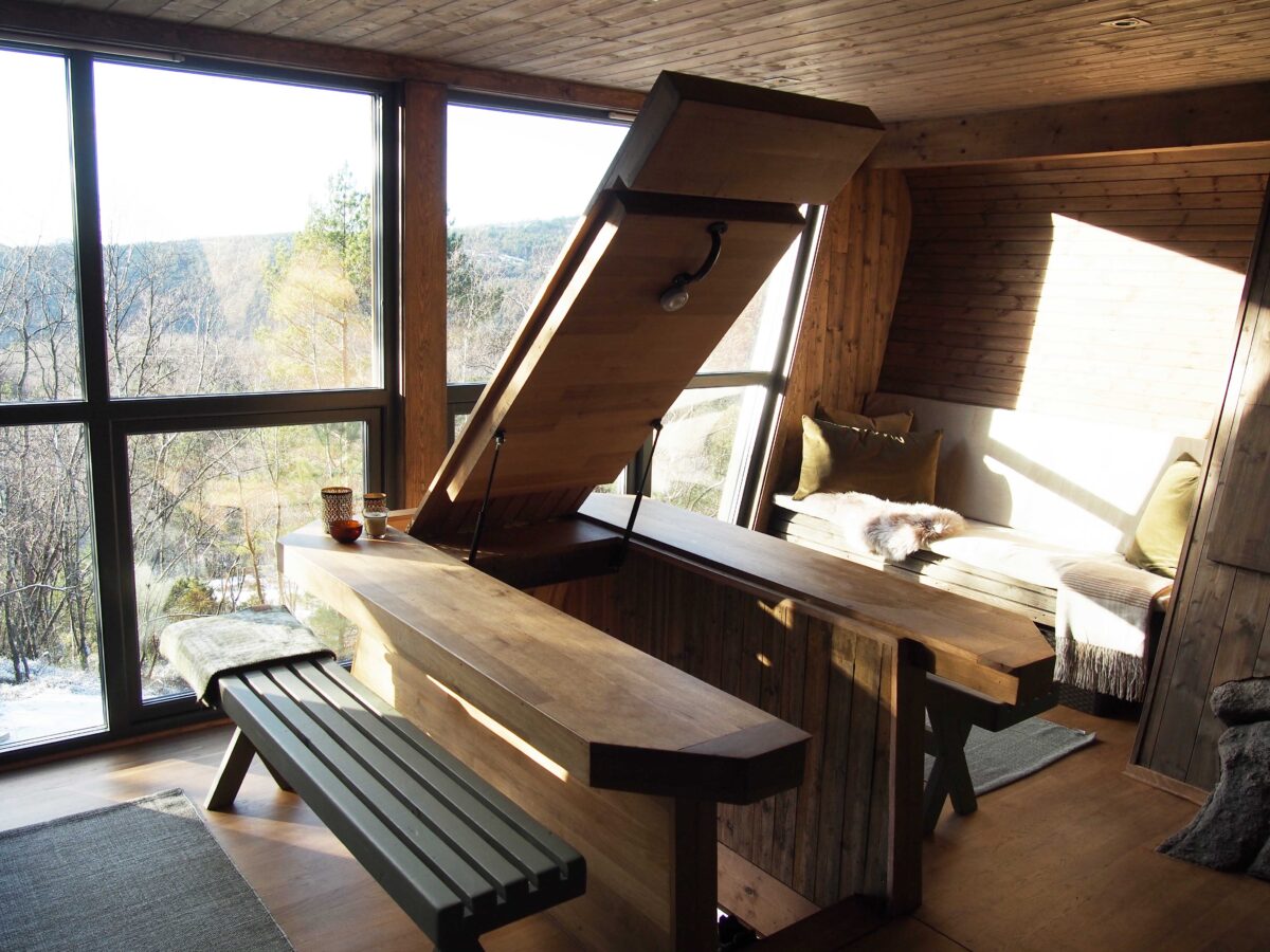 Stuedelen består av et stort spisebord med hevbar midtdel som også er inngangsdør (se bilder), benker til bordet og to sofabenker på hver sin side av bordet.