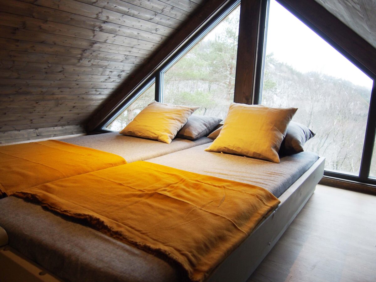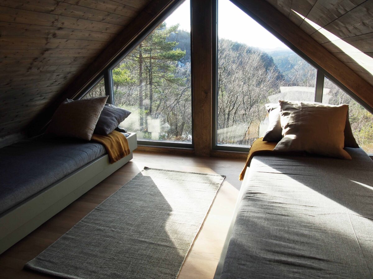 Hytta er bygd inn i en fjellkløft slik at deler av veggene inne i hytta er selve fjellveggene. Her er det en sovealkove med to senger, en hems med to senger og to senger på hver side av kjøkkenet. I alt seks enkle sengeplasser. Det er puter til hver seng men ikke dyner, så sovepose, laken og putetrekk må tas med. Kjøkkenet inneholder vedkomfyr med steikeovn og kokeplate, en koketopp på gass med to bluss, samt utslagsvask, gryter og stekepanne, tallerkner, kopper, glass og bestikk. Det er såpe og vaskemidler tilgjengelig.