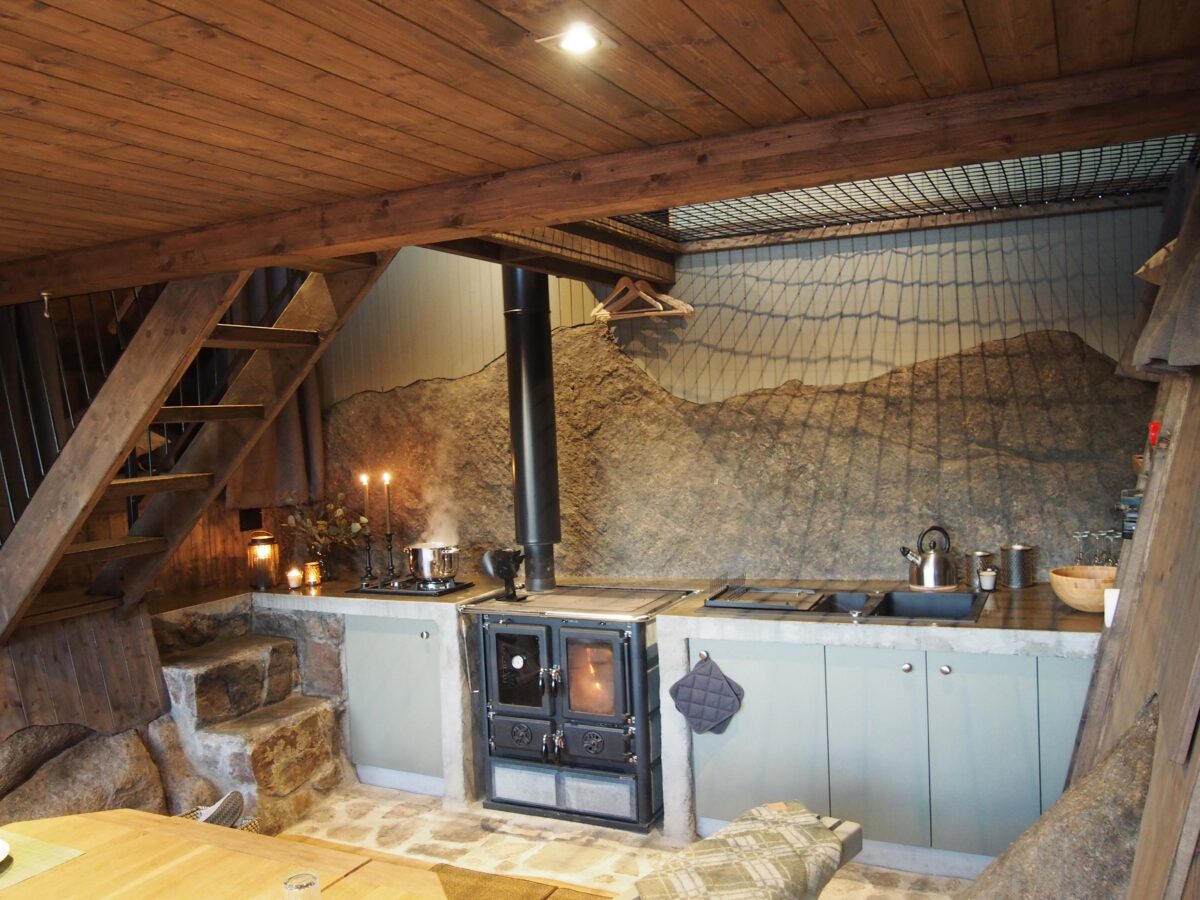 Det er vedkomfyr på hytta, samt gassbluss til mattilberedning.