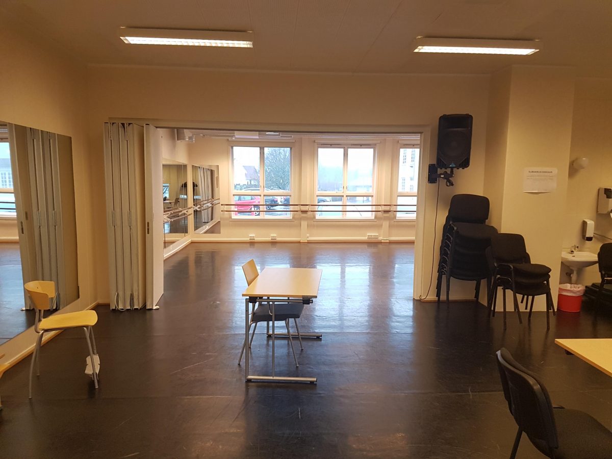 Liten dansesal med dansemater. kan brukes til dansetimer, sangtimer, gruppetimer for styrke, yoga.
