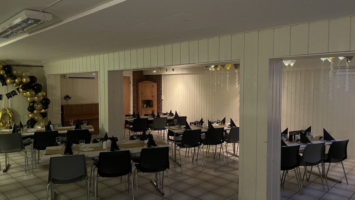 Storsalen – Oppsett med bord og stolar ……. 120 personar