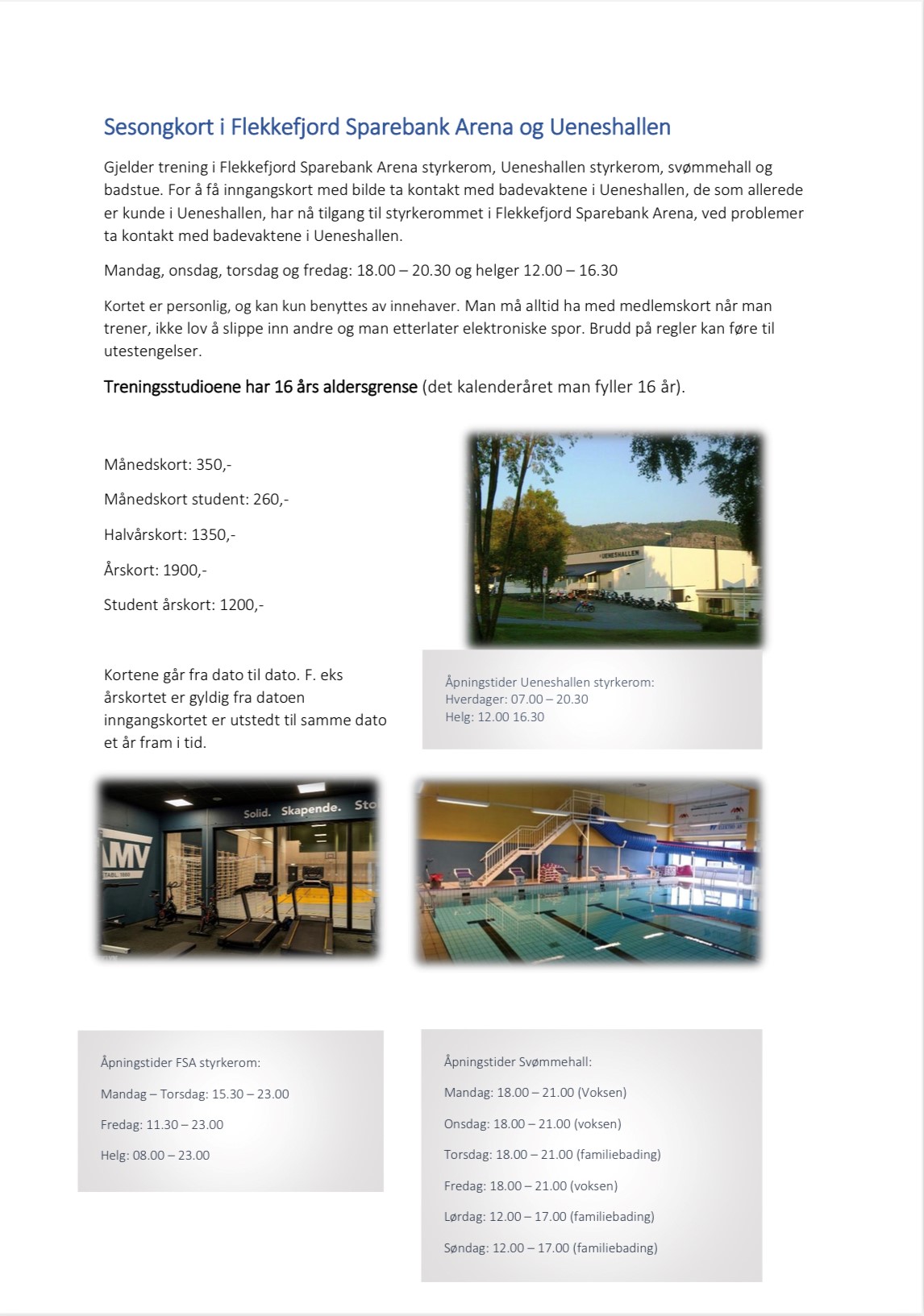 Du kjøper årskort i Ueneshallen i offentlig bading åpningstider. Badevaktene hjelper deg med fotografering og registrering. Du blir da medlem, både i FSA styrkerom og Ueneshallen og får eget nøkkelkort.
