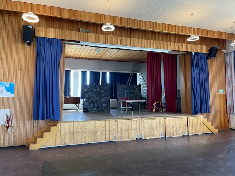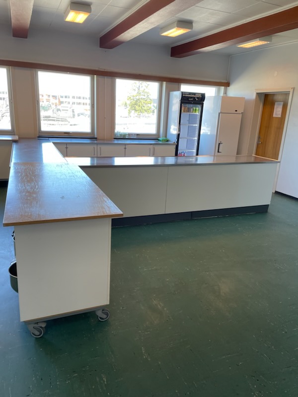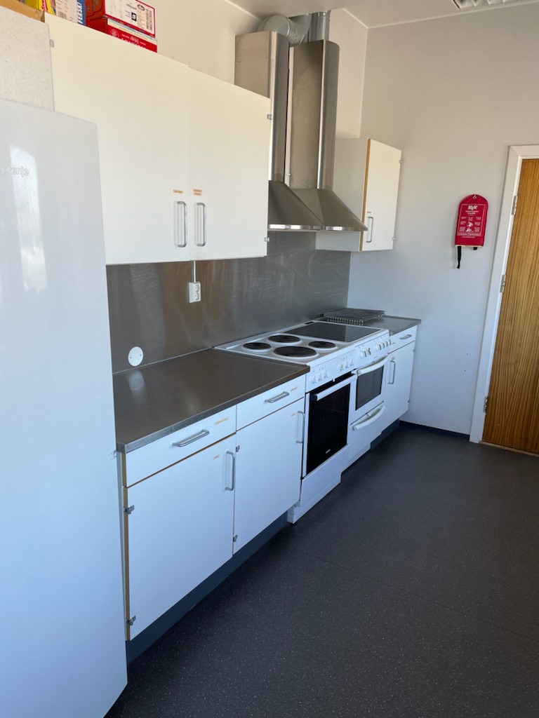 Scene, serveringsdisk og enkelt kjøkken uten utsyr.