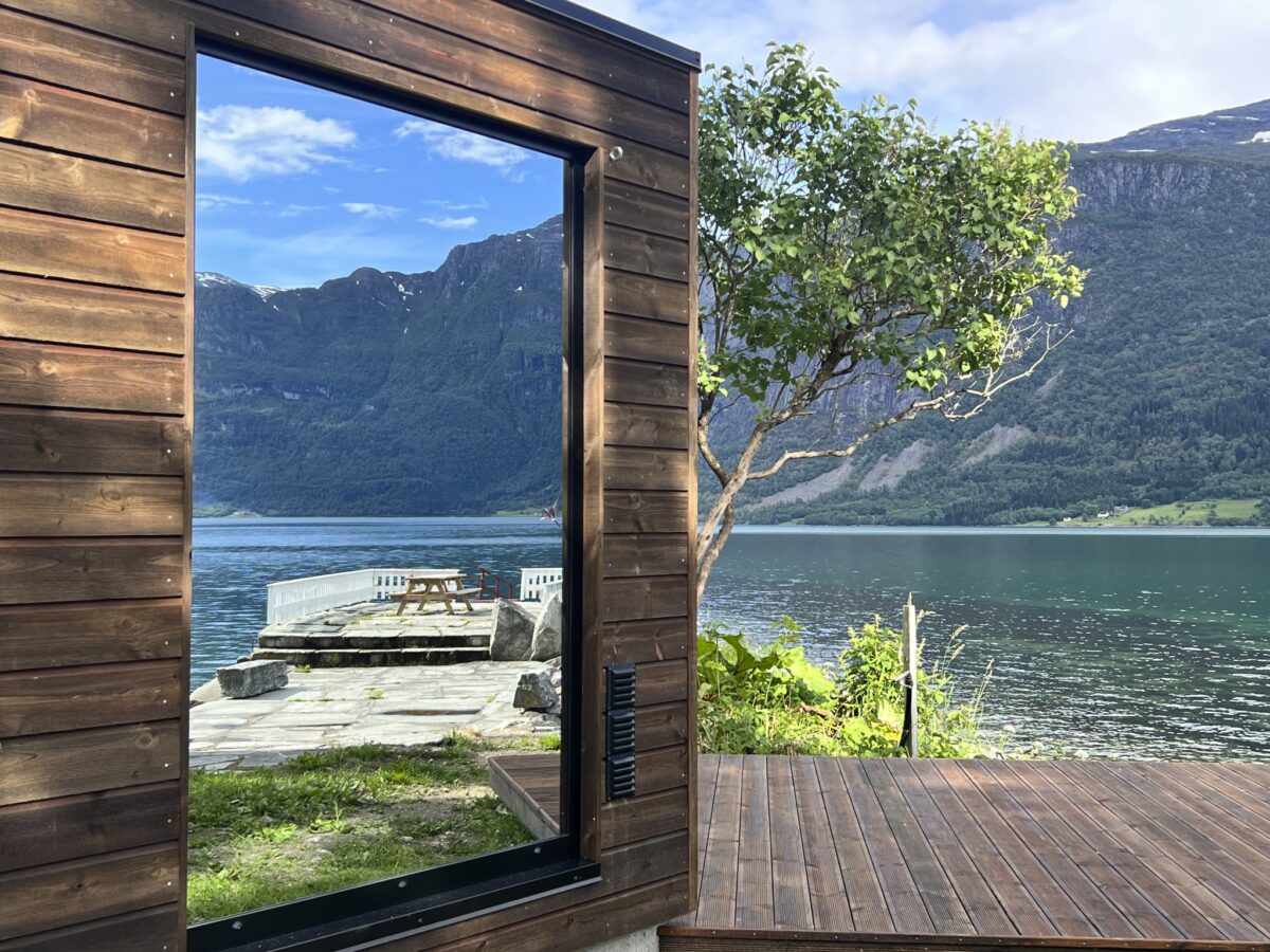Fjordglimt Sauna is designed with a focus on simplicity, accessibility, and health. Perfect for anyone seeking a break from everyday life. You can swim from the pier or from the sandy beach nearby. With mirrored glass on the outside, no one can see in, but you can enjoy the view of the fantastic Lustrafjorden and the surrounding mountains.