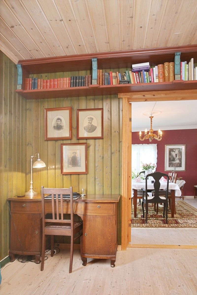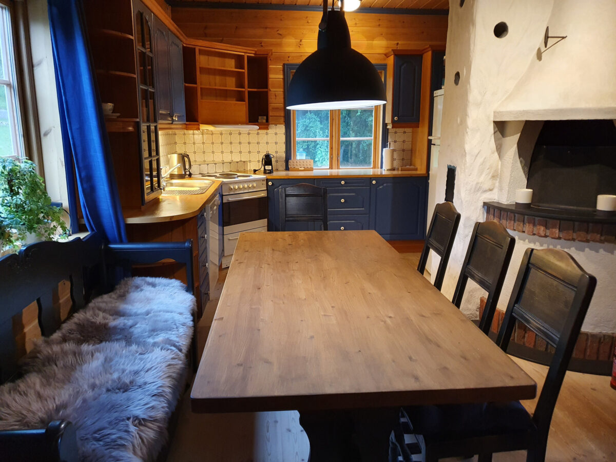 Hovedhus. Peisestue med Chesterfield salong, TV og liten kontorplass. Spisestue i gammel gårdsstil. Flott kjøkken med alle fasiliteter. Ny Mitsubishi varmepumpe på kjøkken som varer godt, og varmen sprer seg til hele huset derfra. Kjøler også. Stort bad med nytt gulv med varme. Ny vaskemaskin, dusjkabinett og avfukter til tørking av klær innendørs.