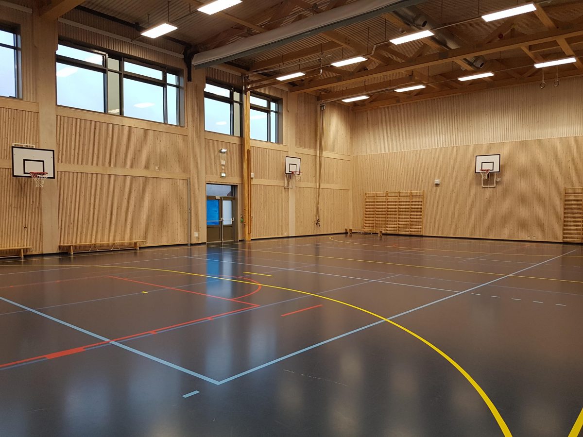 Garderober, dusjer, håndballmål og baskeballkurver.