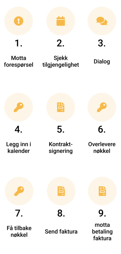 6. Overlevere nøkkel varierer ekstremt. Noen har nøkkel ligge igjen uten “teppet”, mens andre må ha en vaktmester som kommer og leverer. La oss si 10min